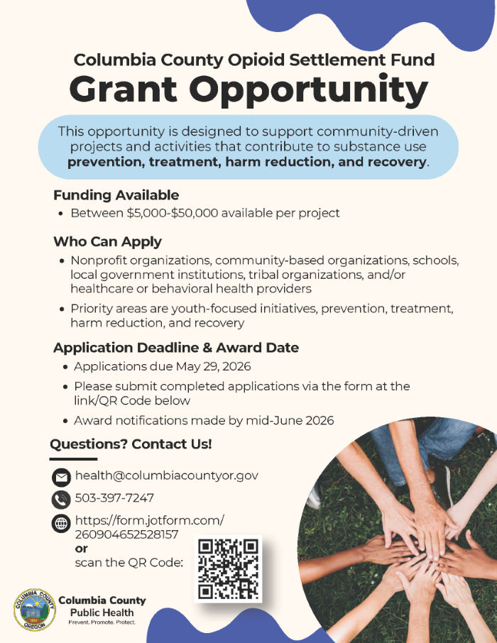 Columbia County Public Health is pleased to announce we are seeking applicants for our 2026-2027 Community Wellness Grant Program, funded through the Columbia County Opioid Settlement Fund (OSF). OSFs originate from national legal settlements related to the opioid crisis and are dedicated to addressing the impacts of opioids and substance use disorder in our communities.